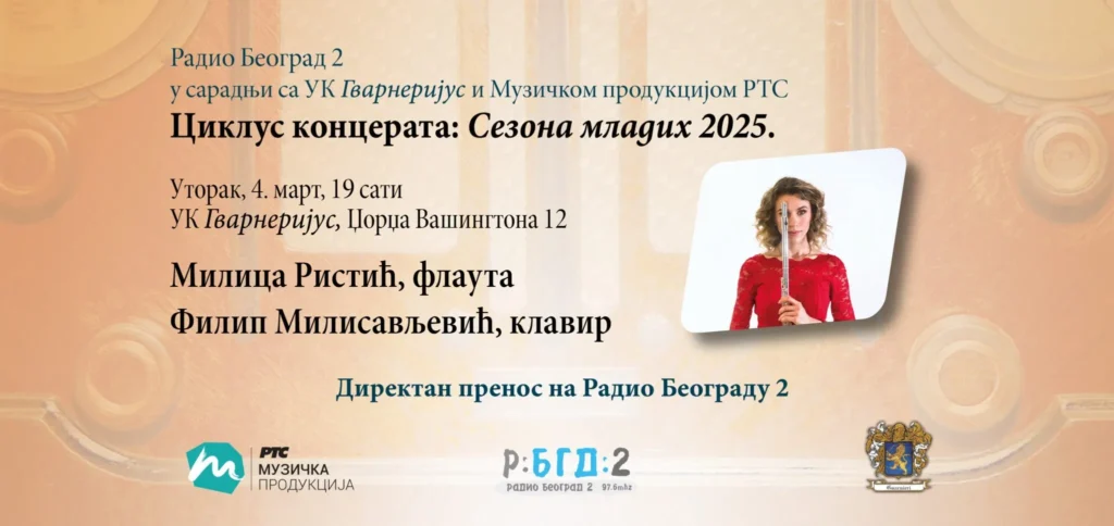 04 mar MUZIKA Posted by admin октобар 3, 2025 0 Ciklus koncerata „SEZONA MLADIH 2025″ – MILICA RISTIĆ, flauta i FILIP MILISAVLJEVIĆ, klavir Ciklus koncerata „SEZONA MLADIH 2025.“ Radio Beograd 2 u saradnji sa Muzičkom produkcijom RTS i Ustanovom kulture Gvarnerij... Continue reading