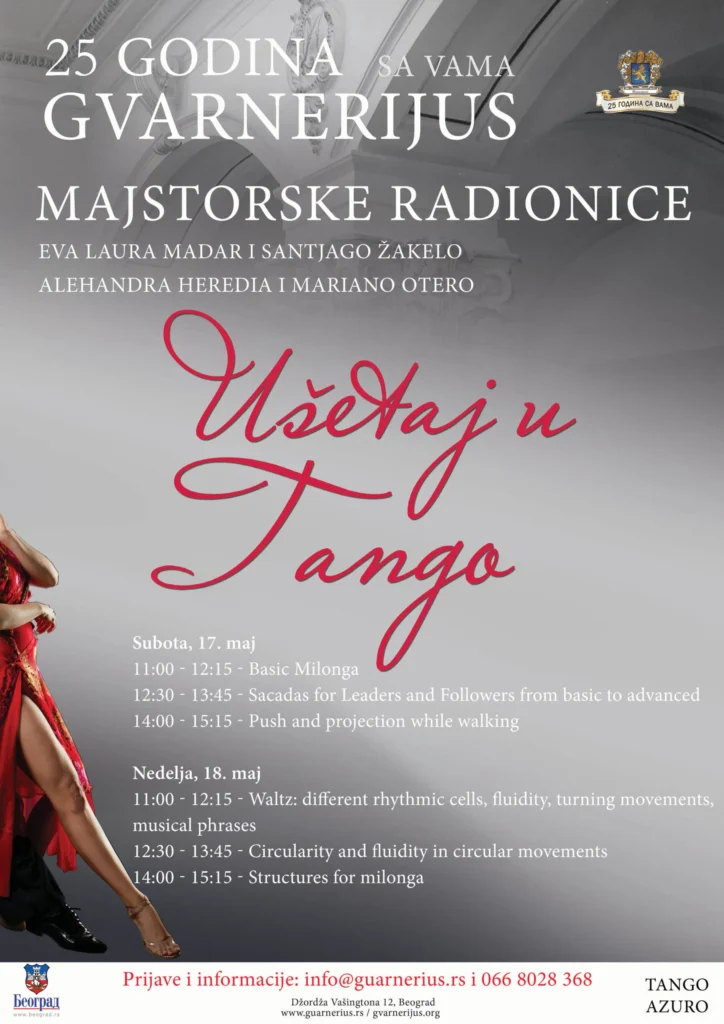 17 maj MUZIKA Posted by admin октобар 3, 2025 0 MAJSTORSKE RADIONICE ARGENTINSKOG TANGA „UŠETAJ U TANGO“ MAJSTORSKE RADIONICE ARGENTINSKOG TANGA „UŠETAJ U TANGO“ Pozivamo vas na majstorske radionice renomiranih svetskih tango p... Continue reading