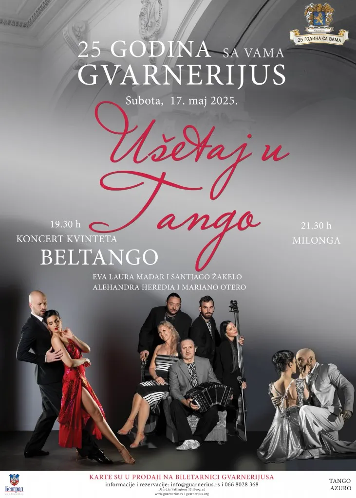 17 maj MUZIKA Posted by admin октобар 3, 2025 0 „UŠETAJ U TANGO“: KONCERT BELTANGO KVINTETA I MILONGA 17. MAJA U GVARNERIJUSU! „UŠETAJ U TANGO“Subota, 17. maj 2025. godine u 19:30č Koncert BELTANGO kvinteta Aleksandar Nikolić (bandoneon), Ivana Nikol... Continue reading