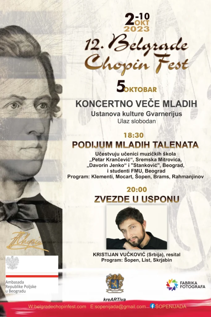 12. BEOGRADSKI ŠOPEN FEST PODIJUM MLADIH TALENATA Četvrtak, 05. oktobar 2023. godine u 18:30 časova Dodatne informacije: ...