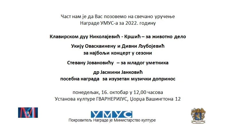 SVEČANA DODELA NAGRADA DODELA 53. GODIŠNJE NAGRADE UMUS-a Ponedeljak, 16. oktobar 2023. godine u 12 časova Organizator: ...