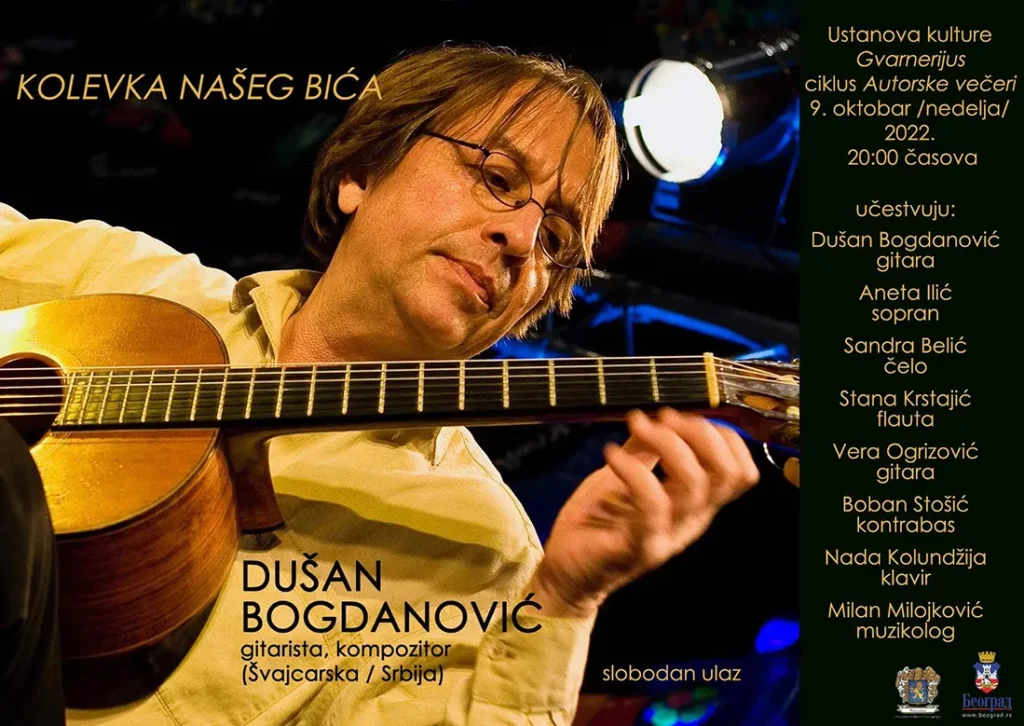 09 okt MUZIKA Posted by admin октобар 3, 2025 0 Izaberite Koncert KOLEVKA NAŠEG BIĆA – DUŠAN BOGDANOVIĆ, gitarista i kompozitor Koncert KOLEVKA NAŠEG BIĆA – DUŠAN BOGDANOVIĆ, gitarista i kompozitor Ciklus Autorske večeri KOLEVKA NAŠEG BIĆA DUŠAN BOGDANOVIĆ, gitarista, kompozitor (Švajcarska / Srbija) „Kompozitor majsto... Continue reading