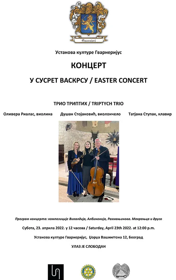 23 апр МУЗИКА Posted by admin октобар 3, 2025 0 У СУСРЕТ ВАСКРСУ – ТРИО ТРИПТИХ ТРИО ТРИПТИХ „У СУСРЕТ ВАСКРСУ“ Оливера Риалас, виолина Душан Стојановић, виолончело Татјана Ступак, клавир Програм: А. ... Continue reading