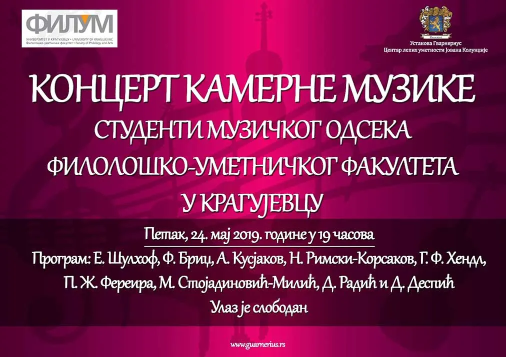 24 maj MUZIKA Posted by admin октобар 3, 2025 0 KONCERT KAMERNE MUZIKE – STUDENTI MUZIČKOG ODSEKA FILOLOŠKO-UMETNIČKOG FAKULTETA U KRAGUJEVCU KONCERT KAMERNE MUZIKE STUDENTI MUZIČKOG ODSEKA FILOLOŠKO-UMETNIČKOG FAKULTETA U KRAGUJEVCU Petak, 24. maj 2019. godine u 1... Continue reading