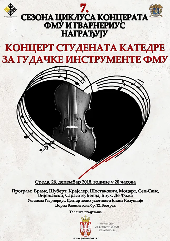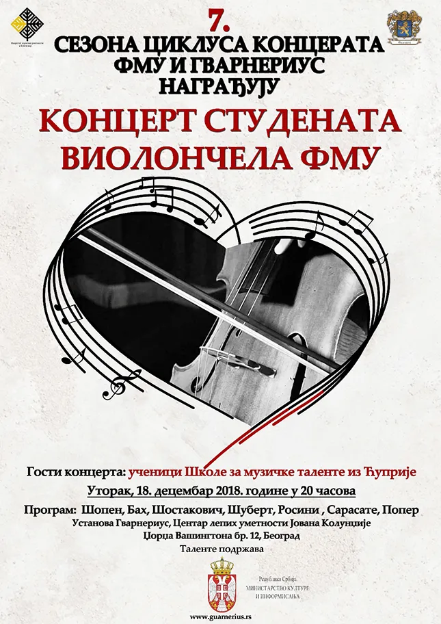 18 dec MUZIKA Posted by admin октобар 3, 2025 0 „FMU I GVARNERIUS NAGRAĐUJU“ – KONCERT STUDENATA VIOLONČELA FMU „FMU I GVARNERIUS NAGRAĐUJU“ KONCERT STUDENATA VIOLONČELA FMU Klasa: Dragan Đorđević, vnr. prof. Utorak, 18. decembar 2018... Continue reading