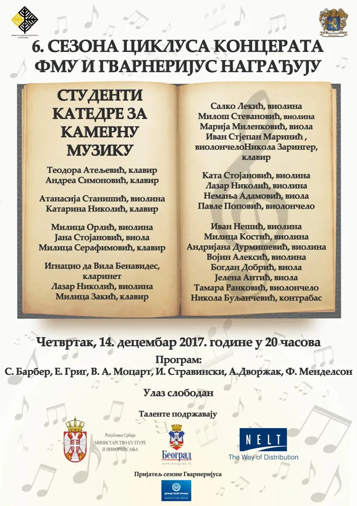 14 dec MUZIKA Posted by admin октобар 3, 2025 0 „FMU I GVARNERIUS NAGRAĐUJU“ – Koncert studenata Katedre za kamernu muziku FMU 6. SEZONA CIKLUSA KONCERATA „FMU I GVARNERIUS NAGRAĐUJU“ Koncert studenata Katedre za kamernu muziku FMU Program: S. Barbe... Continue reading