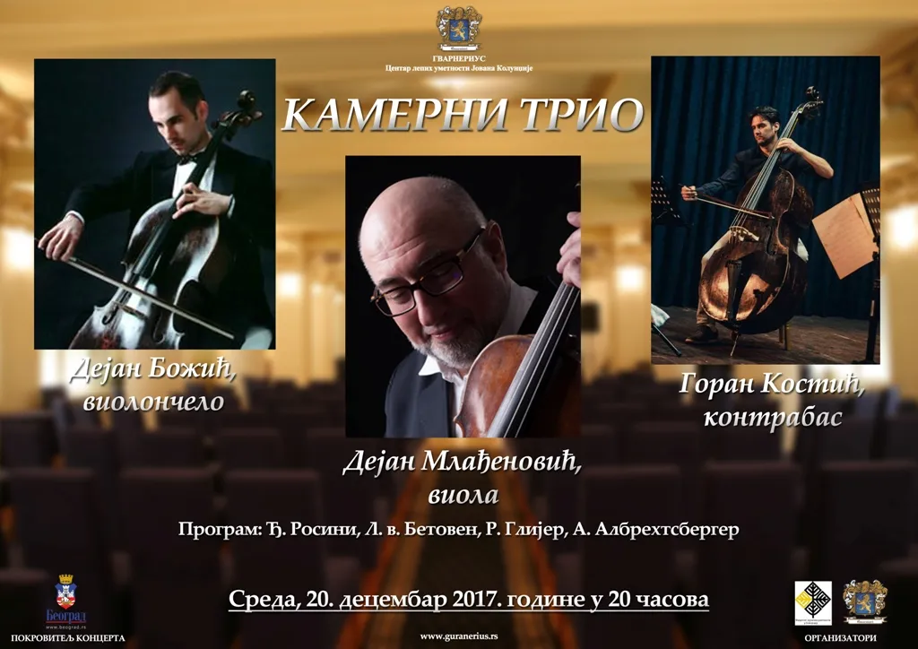 20 dec MUZIKA Posted by admin октобар 3, 2025 0 Koncert kamernog tria – Dejan Mlađenović, viola, Dejan Božić, violončelo, Goran Kostić, kontrabas KAMERNI TRIO Dejan Mlađenović, viola Dejan Božić,violončelo Goran Kostić,kontrabas Program: Đ.Rosini, L.v.Betoven, R.Glij... Continue reading