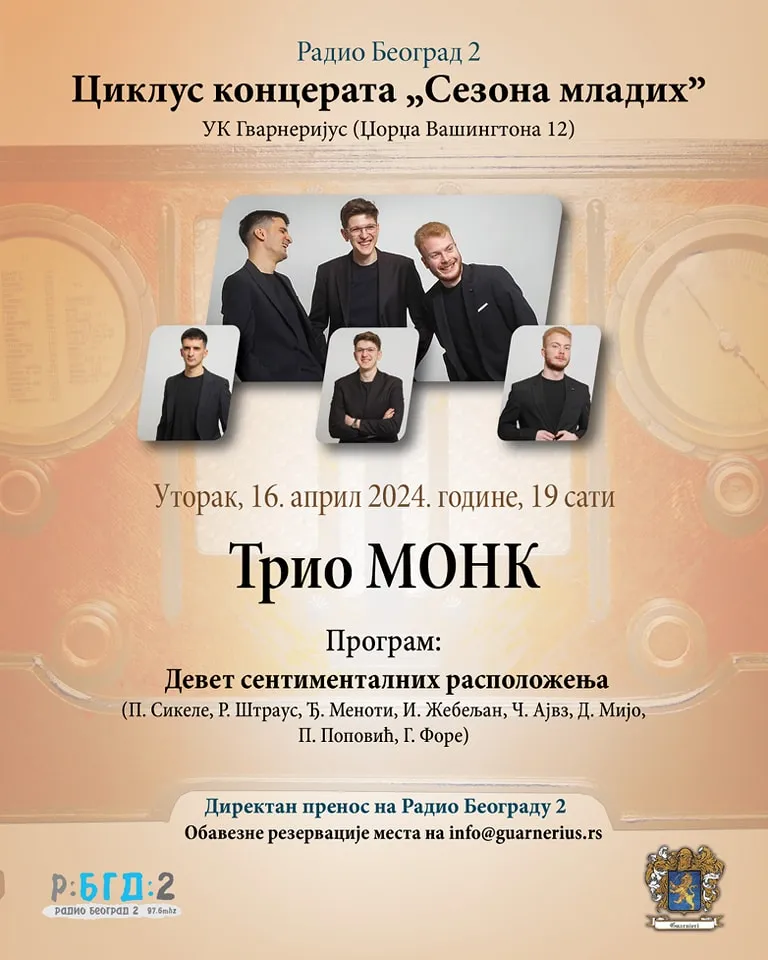 16 апр МУЗИКА Posted by admin октобар 3, 2025 0 РАДИО БЕОГРАД 2 И ГВАРНЕРИЈУС ПРЕДСТАВЉАЈУ ЦИКЛУС КОНЦЕРАТА: СЕЗОНА МЛАДИХ – ТРИО МОНК РАДИО БЕОГРАД 2 И ГВАРНЕРИЈУС ПРЕДСТАВЉАЈУ ЦИКЛУС КОНЦЕРАТА: СЕЗОНА МЛАДИХ Трио МОНК Уторак, 16. април 2024 године у 19 ... Continue reading