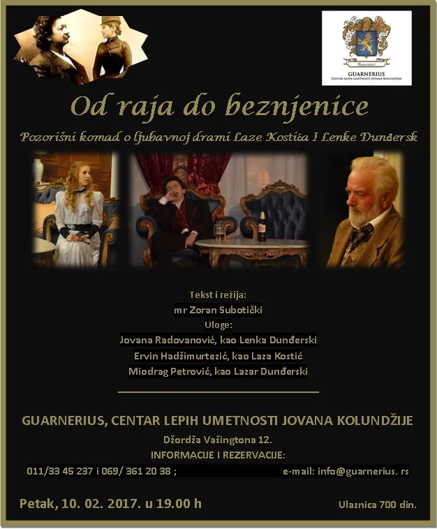 10 feb MUZIKA, MULTIMEDIJA Posted by admin октобар 3, 2025 0 PREMIJERNO U BEOGRADU – PREDSTAVA „OD RAJA DO BEZNJENICE“ PREMIJERNO U BEOGRADU „OD RAJA DO BEZNJENICE“ Pozorišni komad o ljubavnoj drami Lenke Dunđerski i Laze Kostića „Od raja... Continue reading